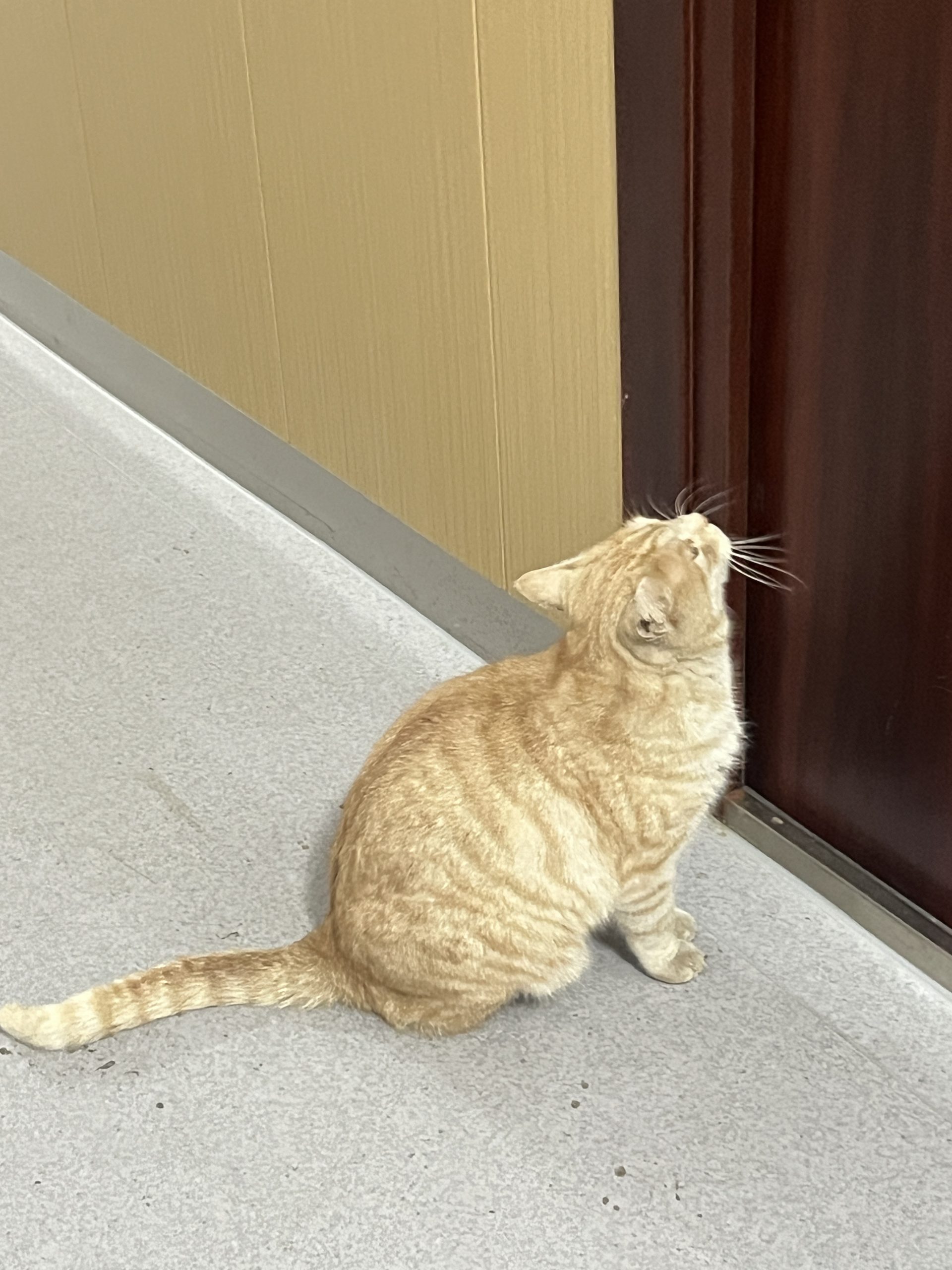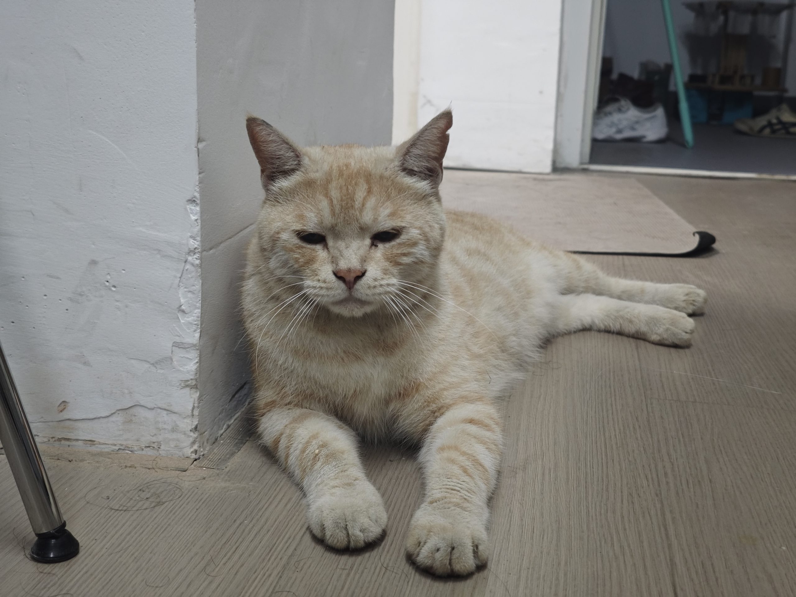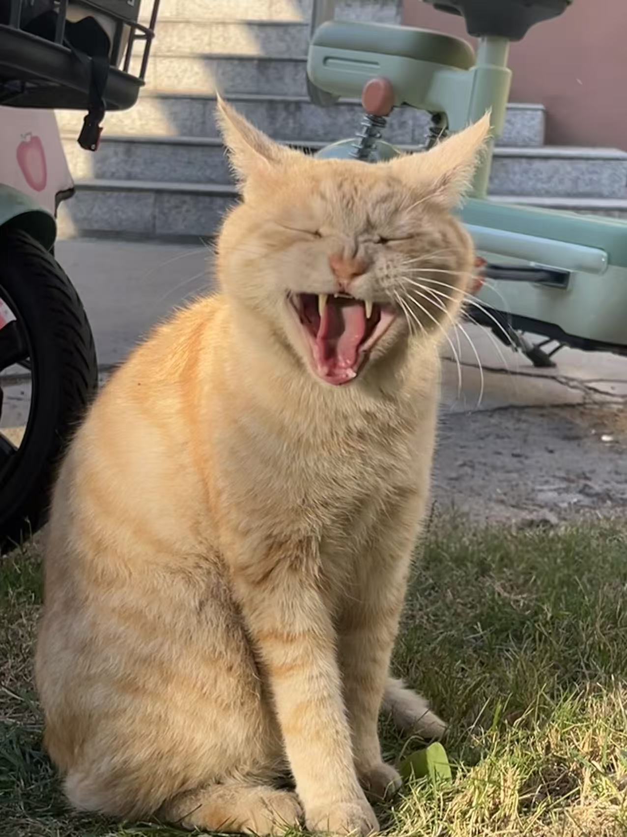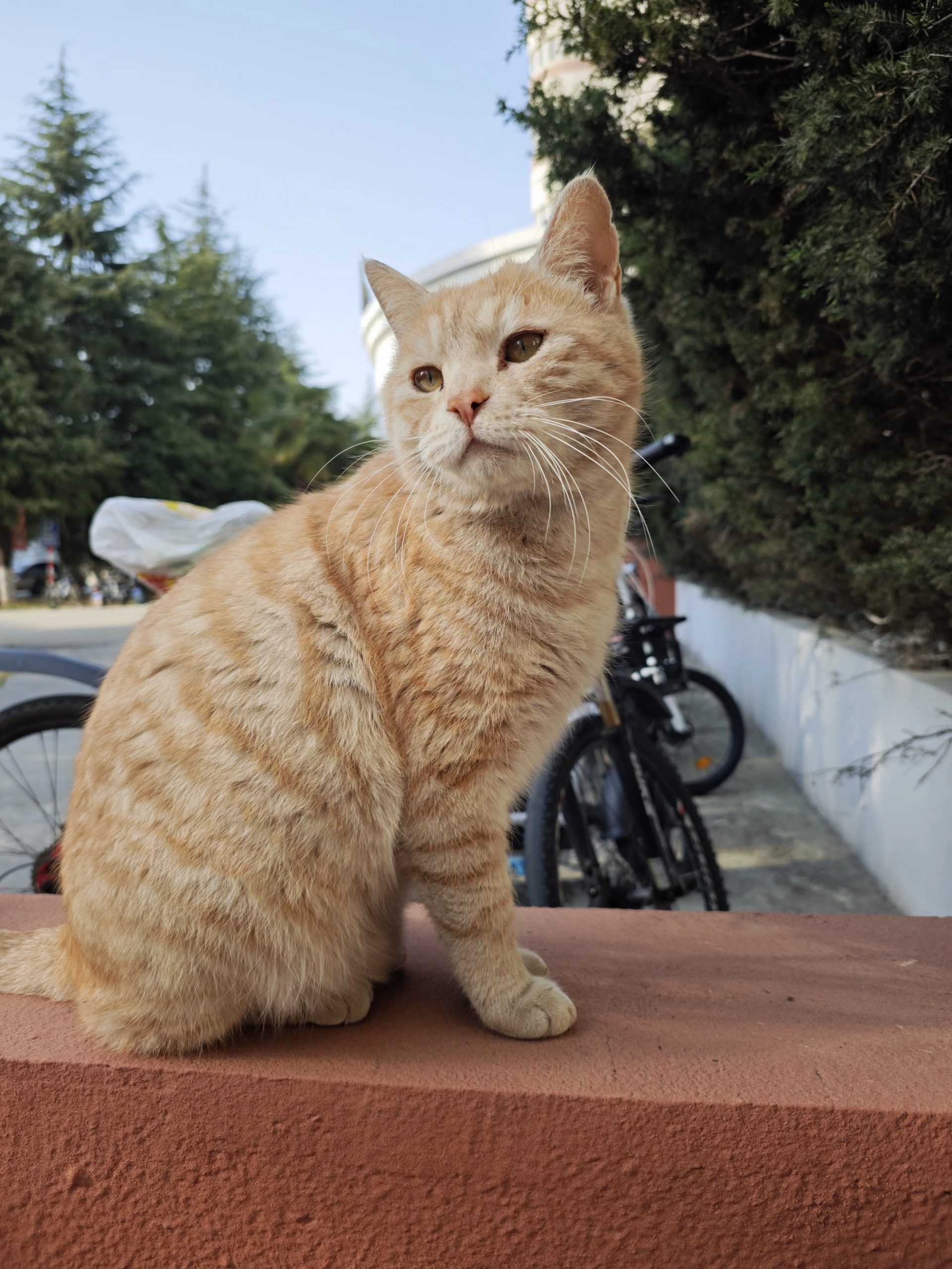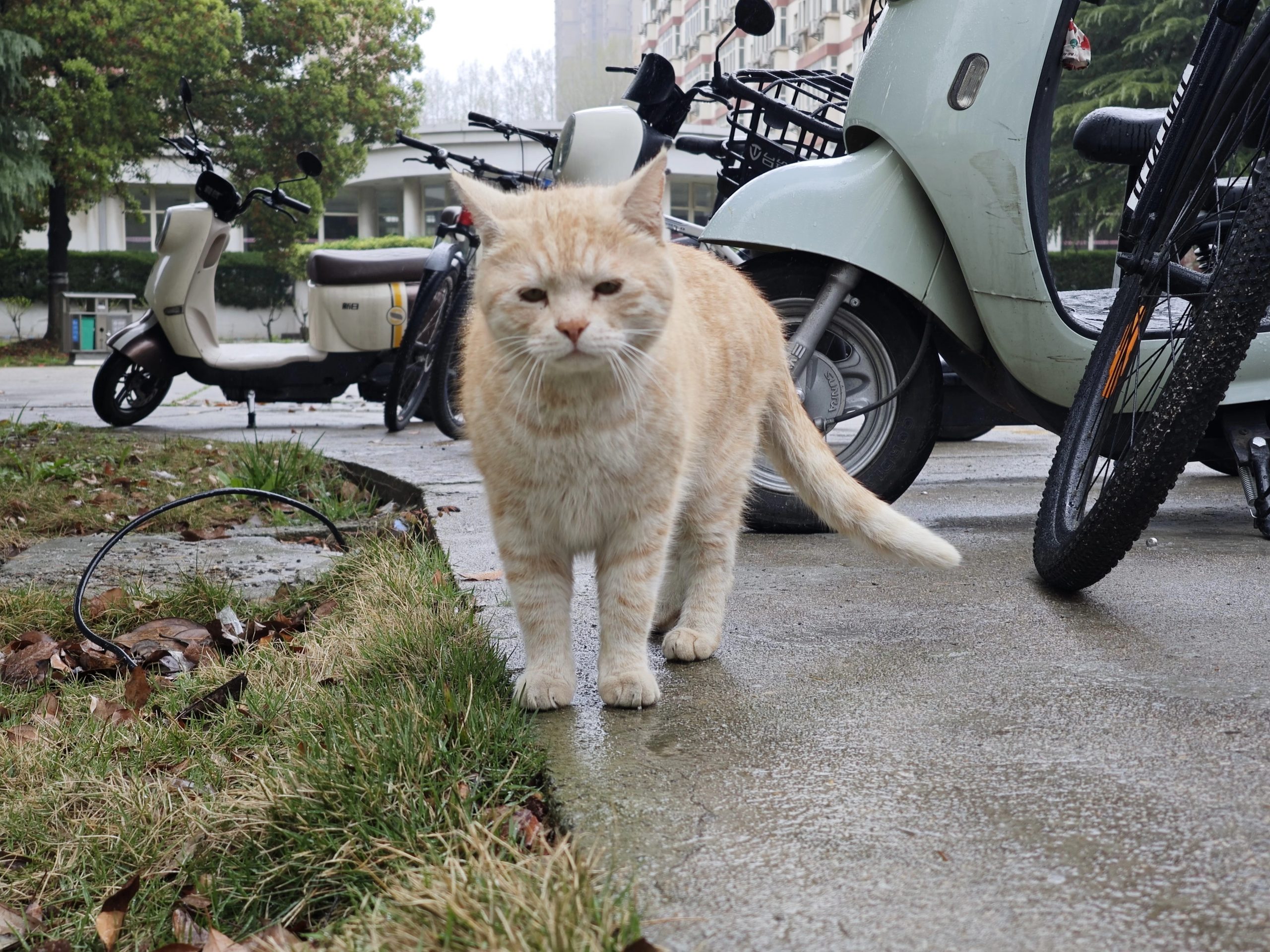 这是皮蛋,一只浅橘色、圆脸、嗓音沙哑的高冷猫猫。他常年混迹在19-21栋周边,喜欢趴台阶、霸占电动车,偶尔也会溜进宿舍蹭暖。