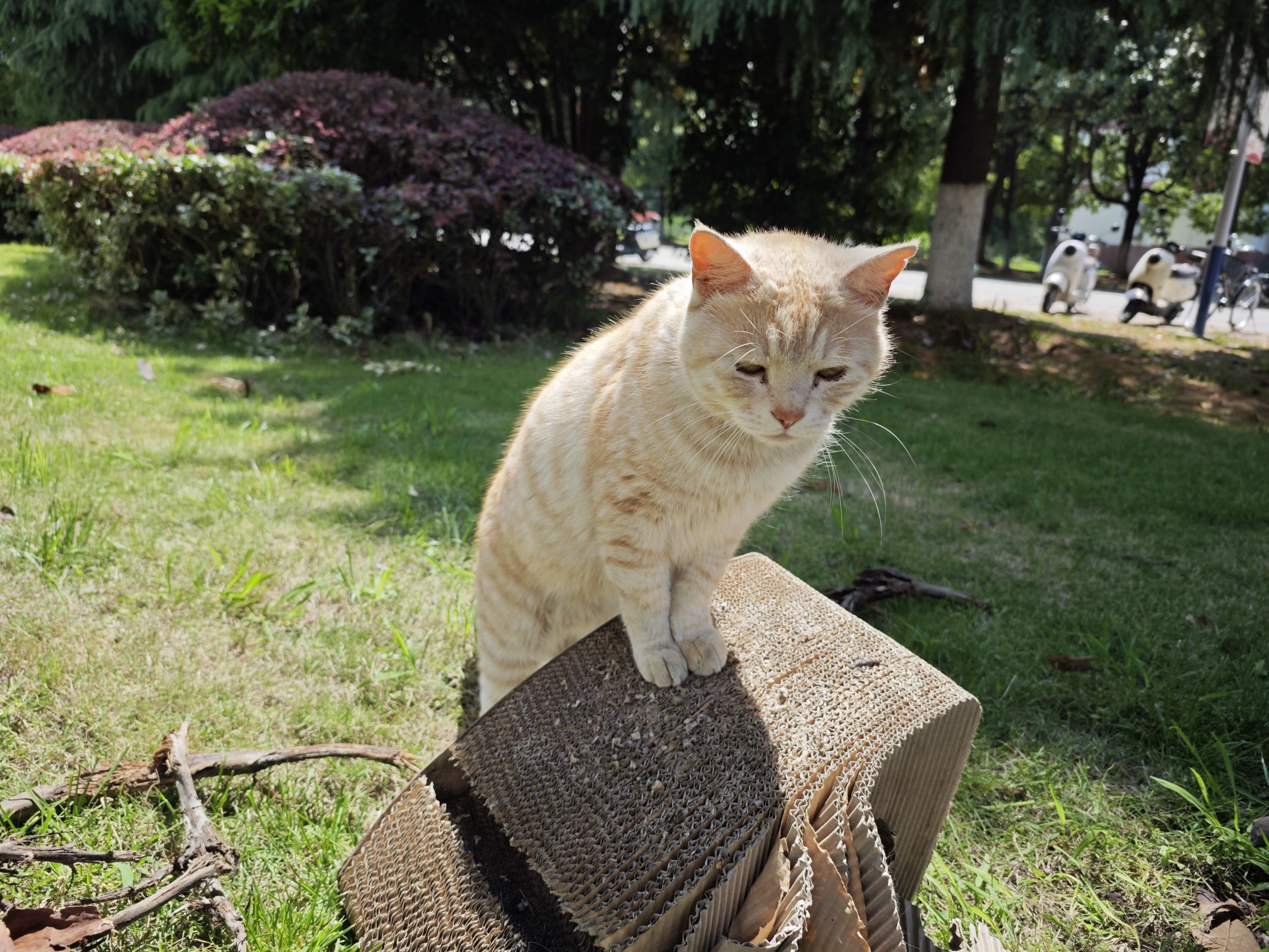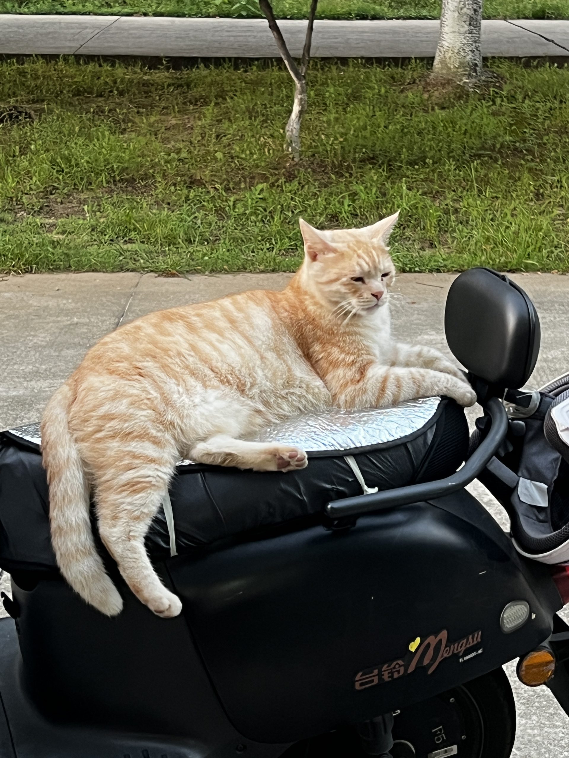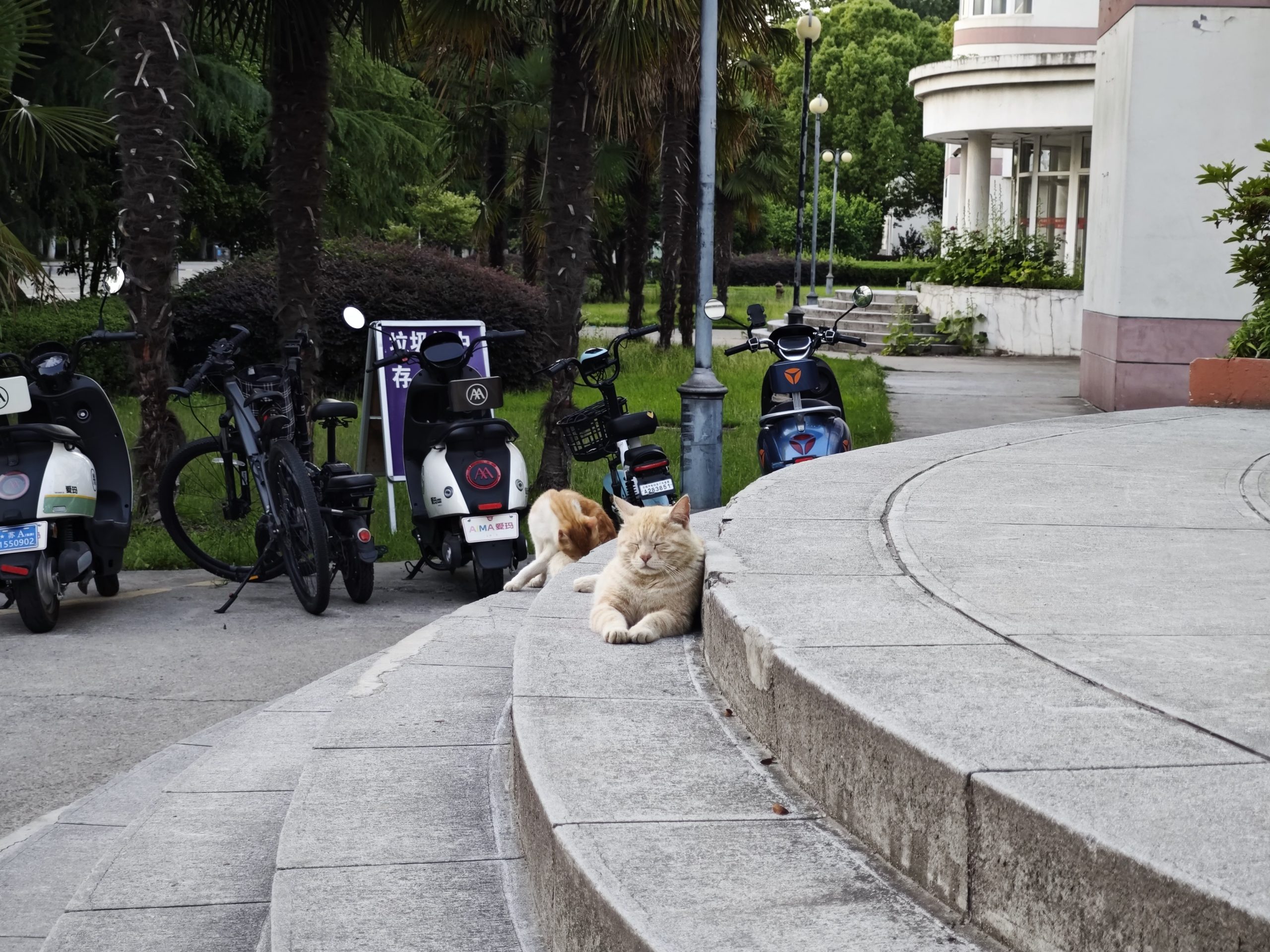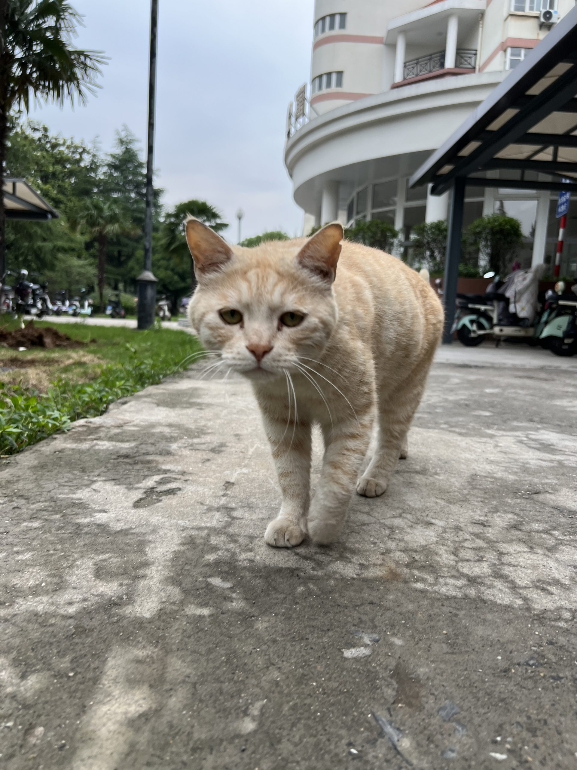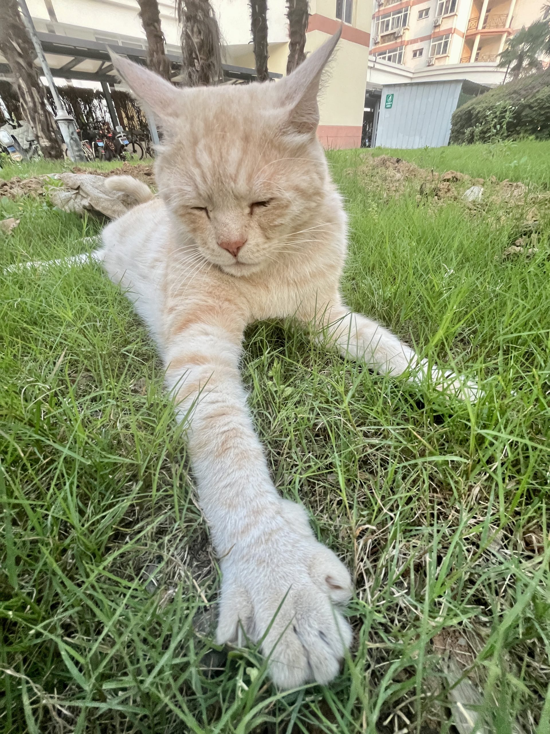 这是皮蛋,一只浅橘色、圆脸、嗓音沙哑的高冷猫猫。他常年混迹在19-21栋周边,喜欢趴台阶、霸占电动车,偶尔也会溜进宿舍蹭暖。